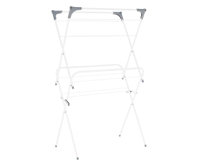Tento moderní sušák na prádlo je vyroben z kovu a plastu v bílé a šedé barvě. Má rozměry 60 cm (délka), 37 cm (šířka) a 105 cm (výška). Balení obsahuje dva kusy.