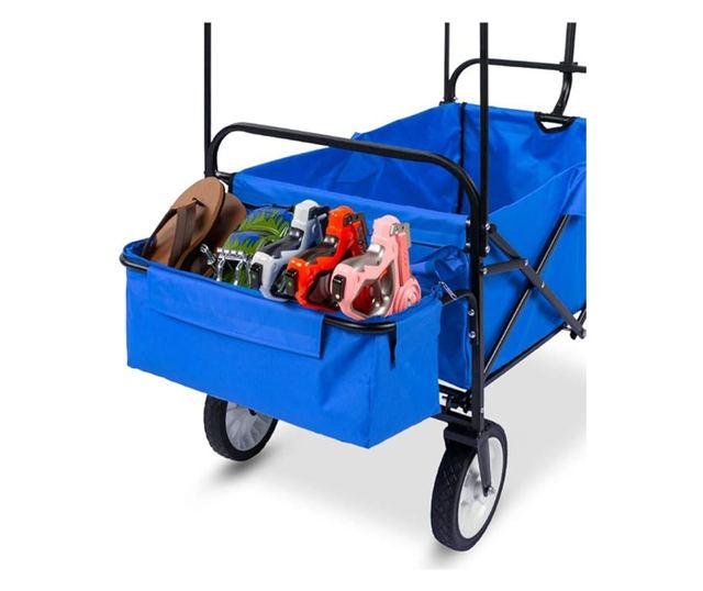 Skládací, přenosný Pro zahradní práce Pro volnočasové aktivity Odnímatelná střecha a úložný prostor Otočná přední náprava Ruční vozík nebo kolečko je velmi užitečný nástroj s mnoha způsoby použití. Při zahradních pracích, na rozdíl od kolečka, nemusíte zvedat váhu nákladu. Můžete v něm přepravovat zeminu, nářadí a mnoho dalšího. Po dokončení práce jednoduše vše vrátíte zpět a složený vozík uložíte do kůlny. Na výletech a túrách je skvělou volbou pro tašky, věci, případně grilovací náčiní. V letní sezóně na pláži je zvláště vhodný pro přepravu dek, ručníků, hraček, chladicích tašek atd. Ať už zahradničíte nebo jste na pláži, děti rády přispějí tažením vozíku a unavenější se mohou posadit dovnitř. Další velmi rozšířené použití je jako rybářský vozík. Tažný vozík má vyjímatelnou vnitřní výplň a střecha je snadno čistitelná, rám je snadno skládací, takže ho můžete vzít kamkoliv s sebou. Skladování nevyžaduje mnoho místa, vejde se kdekoli v garáži nebo do skříně. Na bocích jsou dvě menší kapsy a samostatný odnímatelný úložný prostor pro další věci a potraviny. Rozměry modrého a červeného vozíku: Celková výška: 104 cm Celková šířka: 53 cm Celková délka: 108 cm Výška bočnice: 25,5 cm Šířka nákladového prostoru: 44 cm Délka nákladového prostoru: 78 cm Délka tažné tyče: 62 cm Nosnost: 80 kg Hmotnost balení: 11,2 kg Rozměry balení: 66x55x17,5 cm Hmotnost produktu: 10,3 kg Rozměry provedení s tažením a tlačením: Rozměry produktu: 105x120x55 cm Výška rámu: 22 cm Průměr kola: 17 cm Šířka kola: 4 cm Délka tažné tyče: 91 cm Rozměry tlačné tyče: 45x3x25 cm Rozměry úložných prostor: Malý úložný prostor: 40x10x28 cm Velký úložný prostor: 82x44x28 cm Rozměry zadní kapsy: 12x8 cm Rozměry střechy: 90x55 cm Rozměr mezi střechou a úložným prostorem: 12-46 cm Rozměry balení: 16,5x58x68,5 cm Hmotnost balení: 12,1 kg Hmotnost produktu: 11,2 kg