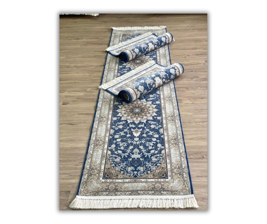 Modrý koberec s klasickým designem, vyrobený z hedvábí a bavlny, o rozměrech 50x125 cm. Tento elegantní malý koberec je ideálním doplňkem do chodby, předsíně nebo malého koutku v domě. Jeho jemný ornament a hluboká modrá barva vytvářejí pocit klidu, stylu a tradice. Hedvábí dodává jemný lesk a měkkost, zatímco bavlněná základna zajišťuje odolnost a dlouhou životnost. Vhodný jak pro klasické, tak pro moderní interiéry, tento koberec nese ducha perského umění do každého prostoru.
