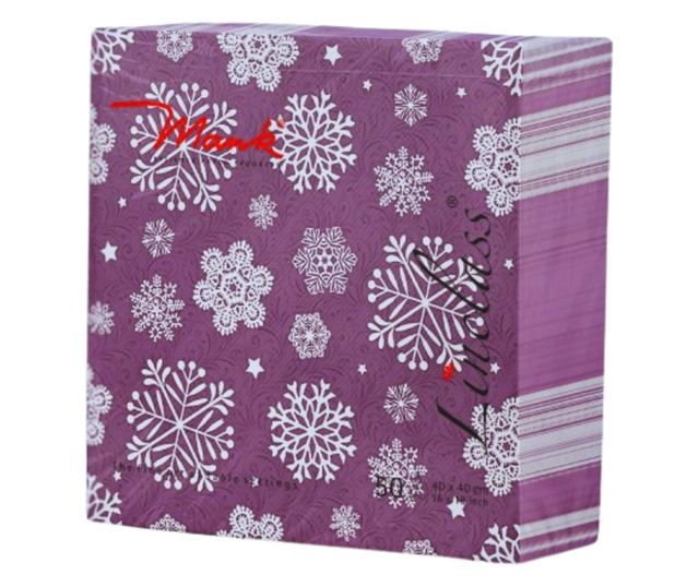 - 1 balení 50 slavnostních ubrousků Linclass Steven (fialové, bílé vločky), 40 x 40 cm.